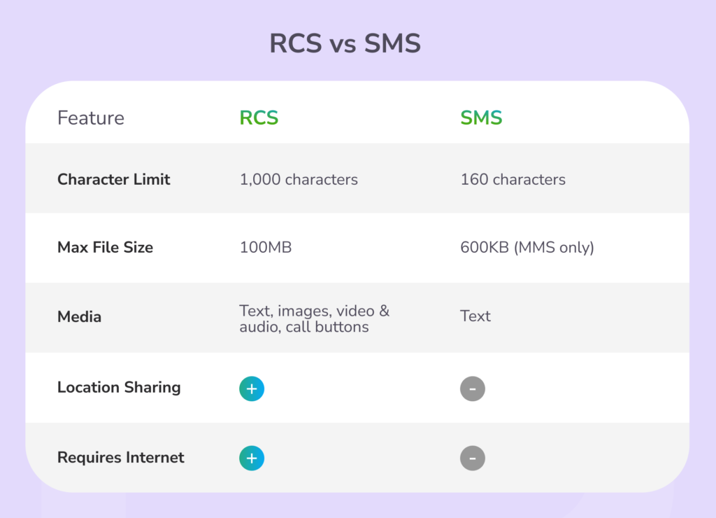Rich Communication Services (RCS) is a next-generation protocol developed to replace SMS. Unlike traditional SMS , RCS messages support the transmission of text, images, videos, and interactive buttons without the 160-character limit. To receive RCS chats, the recipient’s phone must be connected to mobile internet or Wi-Fi, unlike SMS, which only requires network coverage.