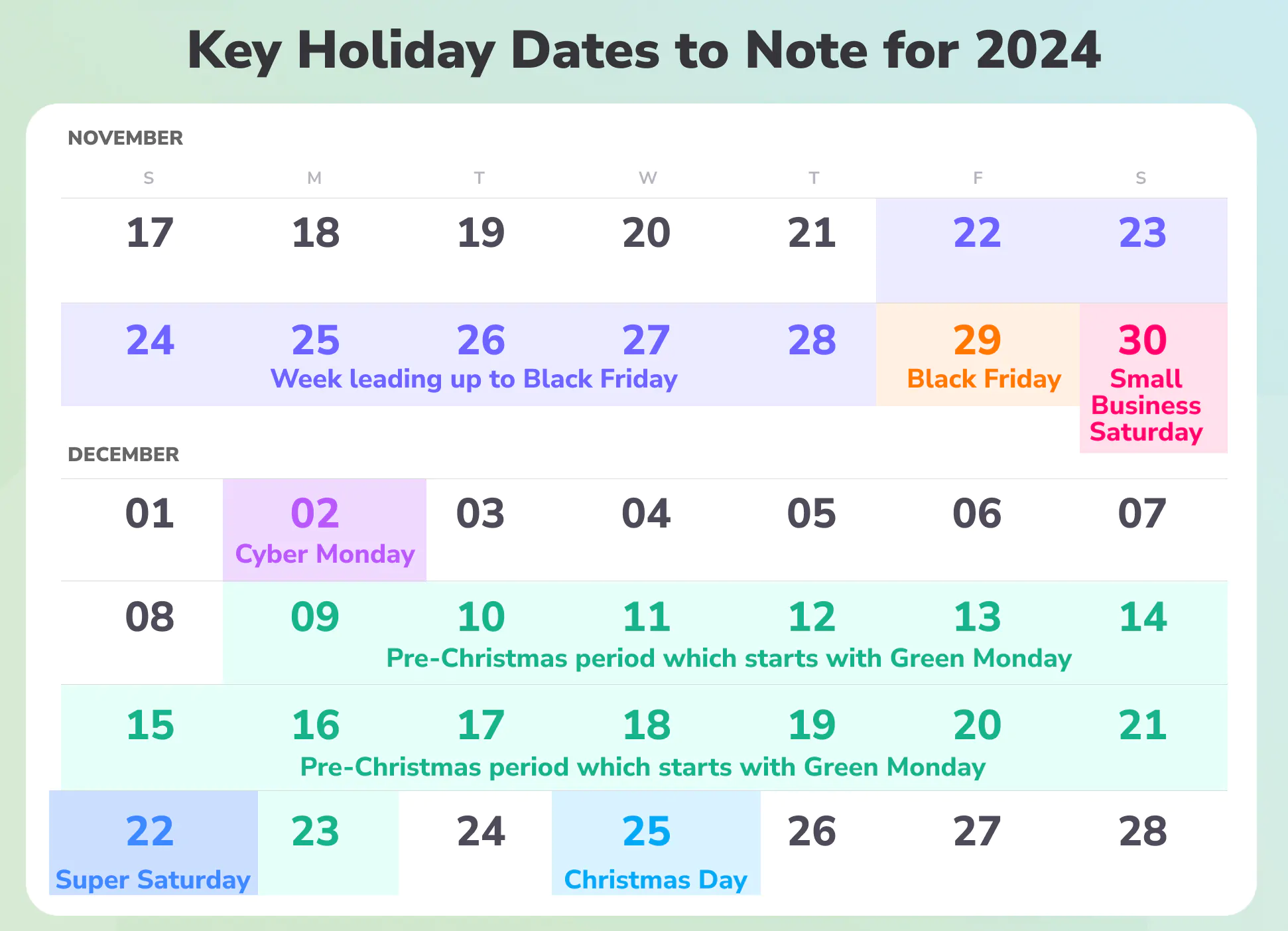 Do not miss important dates of Black Friday and Cyber Monday period and just follow the next calendar: