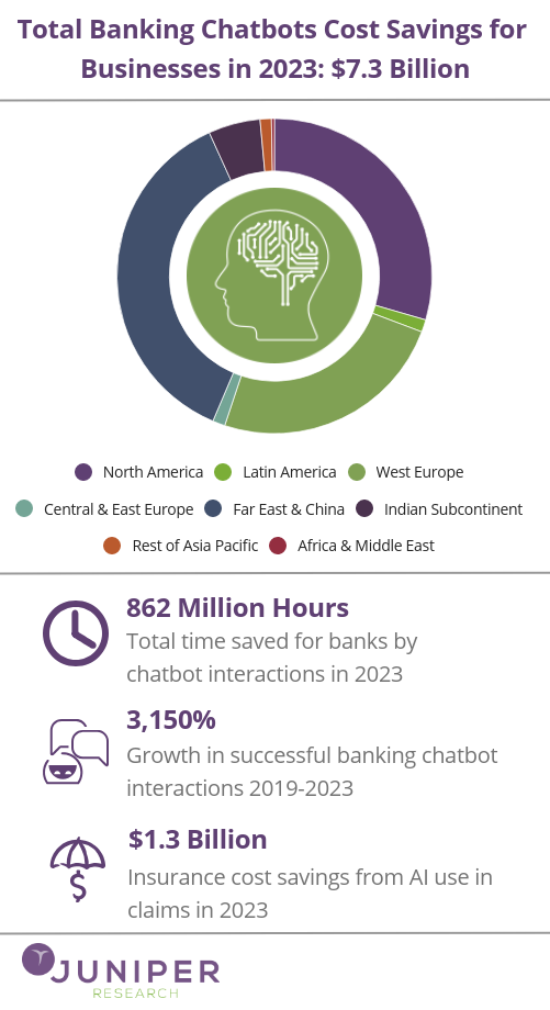 According to a report by Juniper Research in 2017, banks can save a lot of time and money by using chatbots. They found that for every question a voice chat bot handles, it saves agents about 4 minutes of work, which adds up to a cost savings of around $0.70 per question.