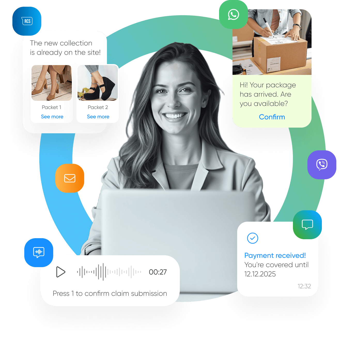 Orchestrate communication across SMS, Viber, Email, WhatsApp, and Voice.