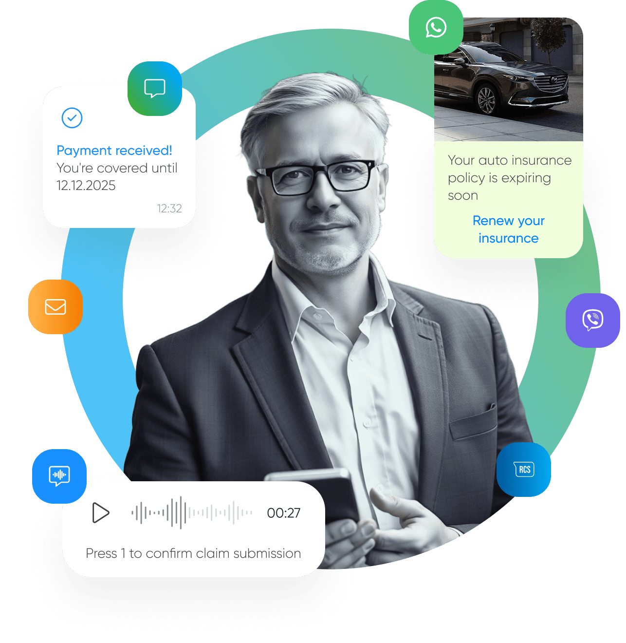 Automate policy renewal reminders via SMS, Email, or Voice — and reduce churn.